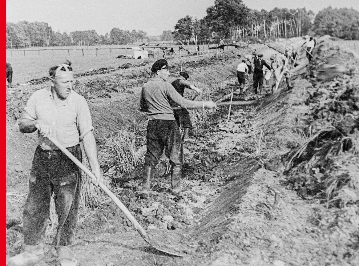 Das junge Unternehmen beginnt mit Entwürfen für Behörden und ersten Entwässerungsarbeiten im Emsland. Bald sind 50 Arbeiter und ein Ingenieurstudent beschäftigt.